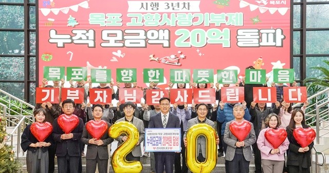 [위키트리 광주전남취재본부 노해섭 기자]목포시는 고향사랑기부제 시행 3년 만에 시민과 향우들의 꾸준한 응원과 참여에 힘입어 12월 16일 기준 누적 모금액 20억 원을 달성했다고 밝혔다.