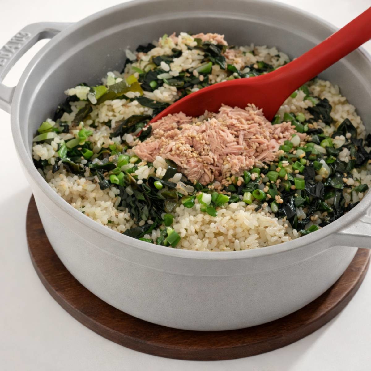 이후 육수를 쌀과 1대1, 혹은 1대0.9 비율로 붓고 쯔유 1큰술을 더한다. 중강불에서 약 5분, 끓기 시작하면 약불로 줄여 10분 정도 익힌다. 불 조절이 중요한데, 이 과정에서 밥이 퍼지지 않고 미역의 향만 은은하게 남는다.