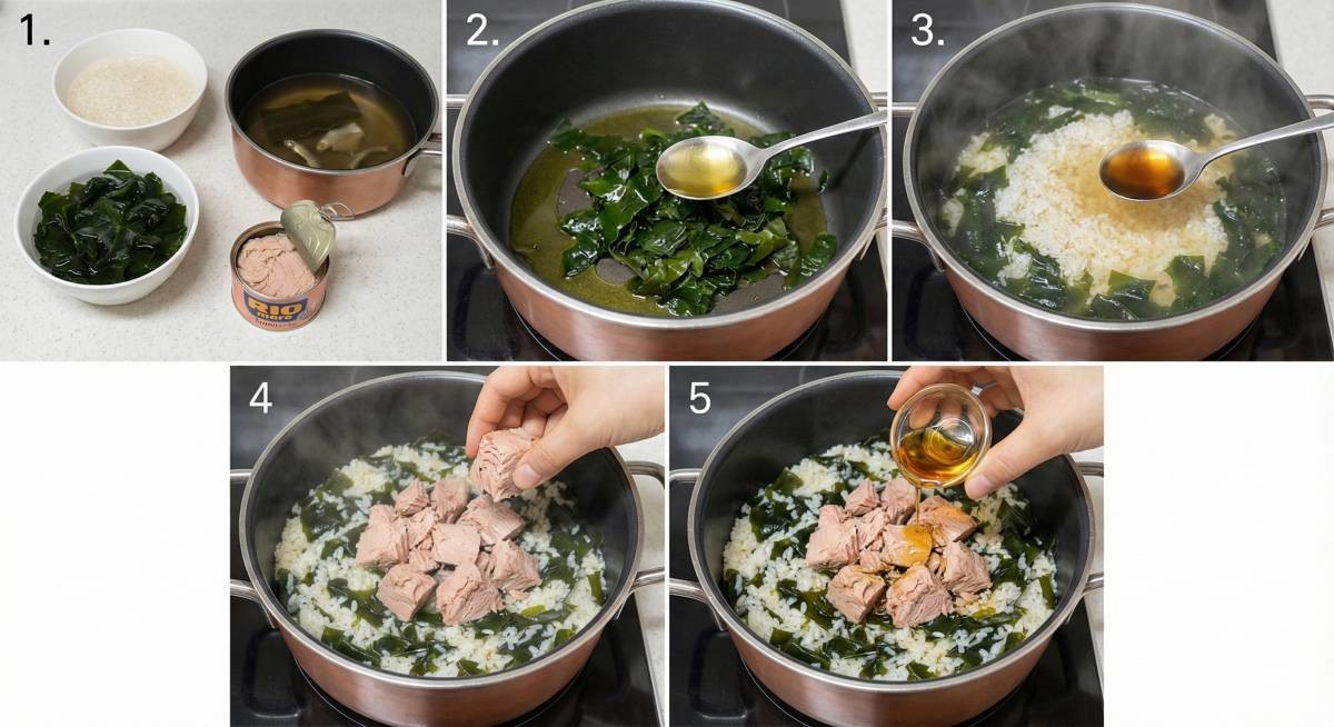 이 요리의 핵심은 재료 구성이 단순하다는 점이다. 쌀 200~250g, 마른미역 15g, 참치캔 1개(약 85g), 그리고 육수만 있으면 된다. 육수는 다시마와 멸치를 기본으로 쓰되, 집에 있는 재료를 활용해도 무방하다. 쌀은 30분 이상 불리고, 미역도 미리 불려 준비한다. 이 과정만 지켜도 식감에서 차이가 난다.