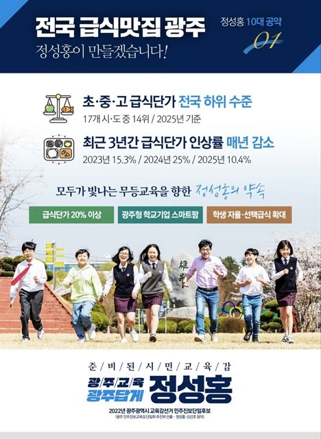 정 예비후보는 "아이들이 매일 먹는 한 끼 식사의 질이 전국 평균 이하라는 사실은, 광주교육청이 과연 아이들을 교육 행정의 최우선 순위에 두고 있는지 근본적인 질문을 던지게 한다"고 지적했다.