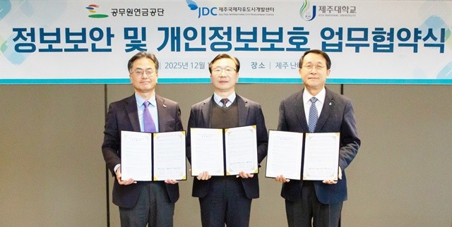 공무원연금공단(이사장 김동극)은 18일, 제주국제자유도시개발센터(JDC), 제주대학교와 정보보안 및 개인정보보호 강화를 위한 3자간 업무협약을 체결했다고 밝혔다.