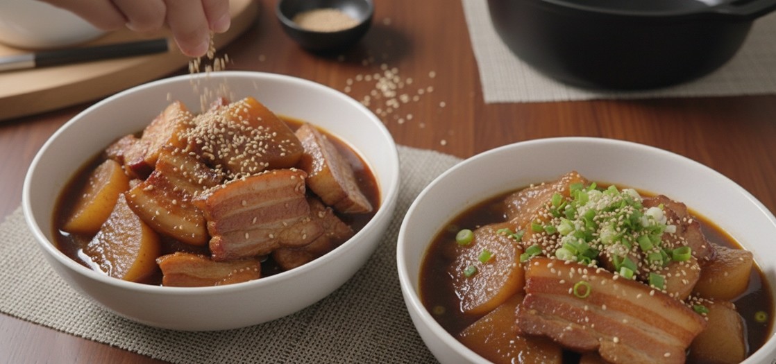 다 익은 무조림은 주걱으로 먹기 좋은 크기로 썰어낸다. 양념이 속까지 충분히 스며들어 힘을 주지 않아도 쉽게 잘린다. 접시에 담은 뒤 대파를 뿌리고 통깨를 살짝 올리면 식당 요리 부럽지 않은 한 끼 반찬이 된다.