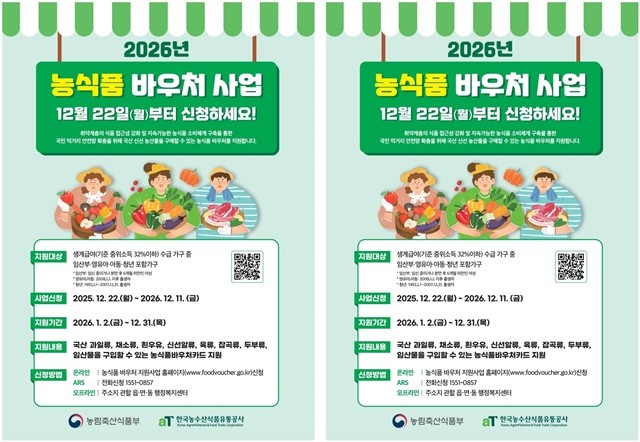 2025년 농식품바우처 이용자의 카드 사용은 이달 31일 종료되며, 기존 이용자는 행복e음 자격검증을 통해 자격이 유지될 경우 별도 신청 없이 자동 연장된다. 반면 신규 대상자는 이달 22일부터 2026년 12월 11일까지 관할 읍·면사무소 방문, 전화(1551-0857), 또는 농식품바우처 지원사업 홈페이지를 통해 신청할 수 있다.