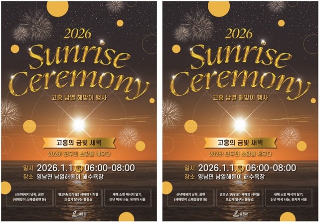 군 관광정책실 관계자는 “2026년 새해를 여는 첫 순간을 함께하며 모두의 소망과 행복을 기원하는 뜻깊은 자리가 될 것”이라며 “간소하지만, 품격 있는 행사로 고흥의 따뜻한 공동체 정신을 보여주겠다”고 말했다.