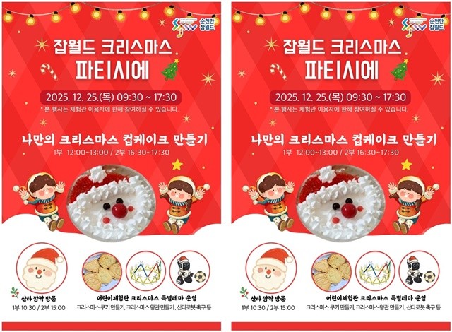 순천만잡월드 관계자는 “아이들이 크리스마스를 맞아 가족과 함께 의미 있는 시간을 보내며 따뜻한 추억을 쌓길 바란다”며 “올 한 해 순천만잡월드 어린이체험관을 방문해 주신 모든 분들께 감사의 뜻을 전한다”고 말했다.