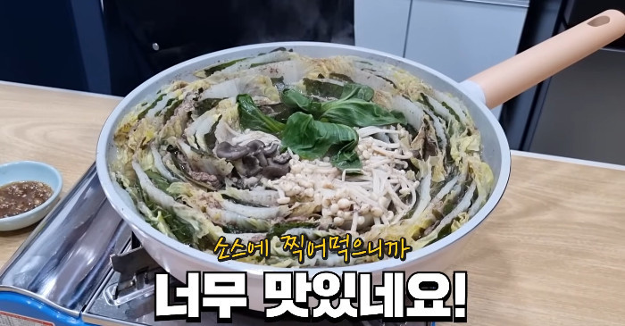 냄비 바닥에 배추와 얇게 썬 고기, 버섯을 겹겹이 세워 담는다. 물은 재료가 잠길 듯 말 듯만 붓고, 라면 스프를 반에서 세 분의 이 정도만 넣는다. 센 불에서 끓이다가 끓어오르면 중불로 줄여 배추가 부드러워질 때까지 익히면 끝이다. 마지막에 후추를 약간 뿌리거나 파를 올리면 완성도가 높아진다. 국물이 부족해지면 물을 조금씩 보충해도 간이 쉽게 무너지지 않는다.
