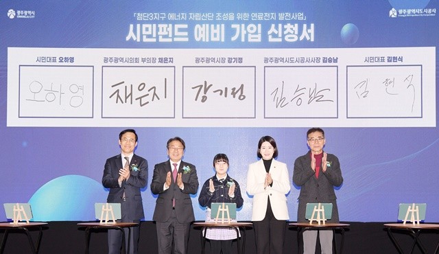 [위키트리 광주전남취재본부 노해섭 기자]강기정 광주광역시장이 19일 오후 시청 시민홀에서 열린 첨단3지구 연료전지 발전사업 시민펀드 출범행사에 참석하여 시민펀드 가입 서명을 한 후 참석자들과 함께 기념촬영을 하고 있다. /광주광역시 제공