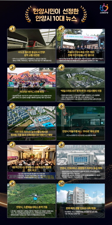 안양시가 한 해의 시정을 정리하며 시민이 뽑은 ‘2025년 안양시 10대 뉴스’를 발표했다. 시는 시민 체감형 교통·스마트시티·복지·혁신 행정 성과 등 다양한 분야에서 의미 있는 발전을 이뤘다고 밝혔다.