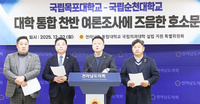 전남도의회 ‘통합대학교 국립의과대학 설립 지원 특위’는 22일 호소문을 통해, “정부의 최종 정책 결정을 앞둔 지금이야말로, 지역사회와 대학 구성원의 책임 있는 선택이 무엇보다 중요한 시점”이라고 강조했다.
