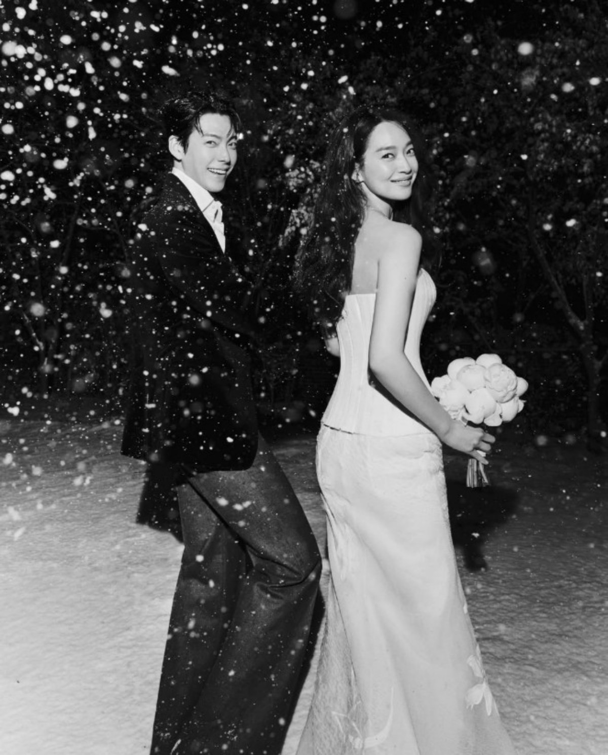 공개된 사진 속 신민아는 꽃잎과 눈꽃을 연상케 하는 순백의 튜브톱 웨딩드레스를 입고 우아한 자태를 뽐냈다. 하트 라인의 유트톱 디자인에 얇은 리본 디테일이 잘록한 허리를 강조했으며, 다이아몬드 초커 네크리스를 매치했다.