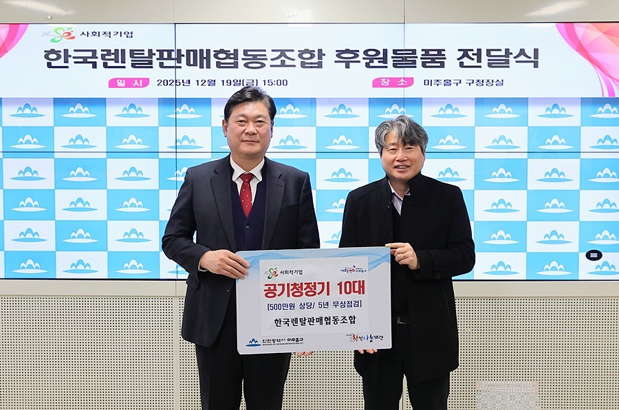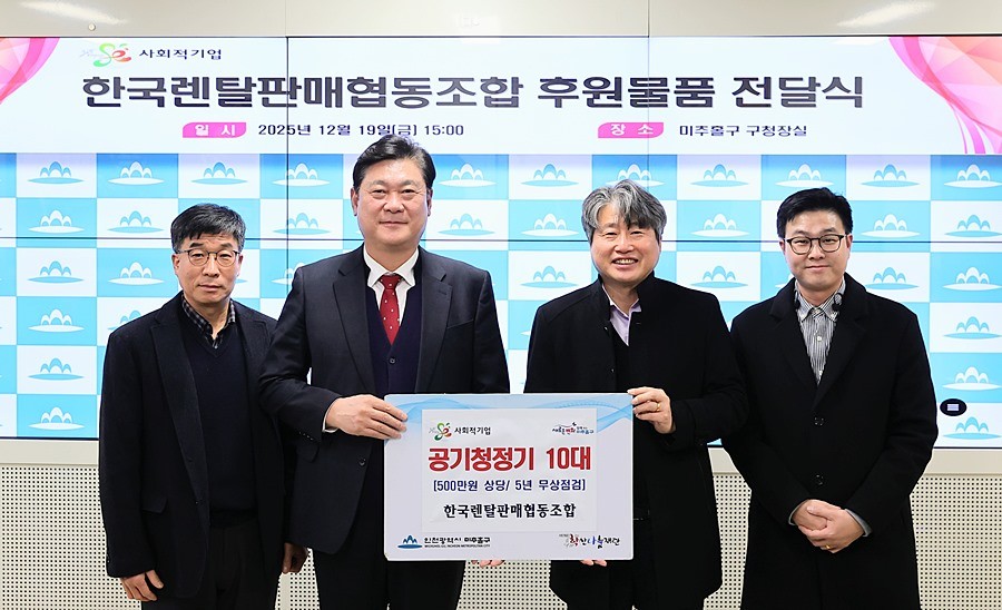 인천 미추홀구(구청장 이영훈)는 지난 19일 사회적기업 한국렌탈판매협동조합(대표 정영이)으로부터 공기청정기 10대를 전달받았다.