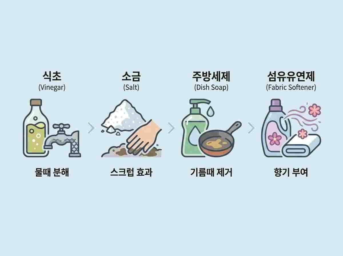 각 재료가 맡는 역할은 비교적 명확하다. 식초는 산성 성분으로 물때와 비누 찌꺼기를 분해하는 데 효과적이다. 소금은 미세한 입자가 남아 스크럽 역할을 하며, 타일이나 세면대에 붙은 찌든 때를 물리적으로 긁어낸다. 주방세제는 기름때 제거에 강점이 있고, 섬유유연제는 청소 후 공간에 남는 향을 담당한다.