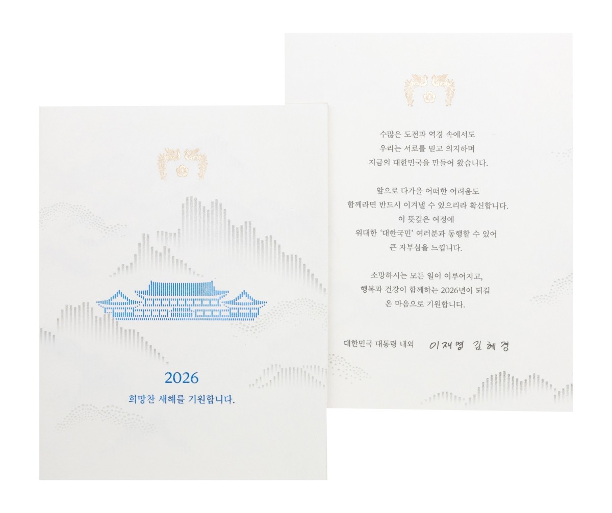 이 대통령은 연하장에 “수많은 도전과 역경 속에서도 우리는 서로를 믿고 의지하며 지금의 대한민국을 만들어 왔다”는 취지의 문장을 담았다. 앞으로 다가올 어떤 어려움도 함께라면 이겨낼 수 있다는 다짐도 덧붙였다. 또 “위대한 대한민국 국민과 이 뜻깊은 여정을 함께할 수 있어 큰 자부심을 느낀다”는 표현으로 새해 인사를 마무리했다.