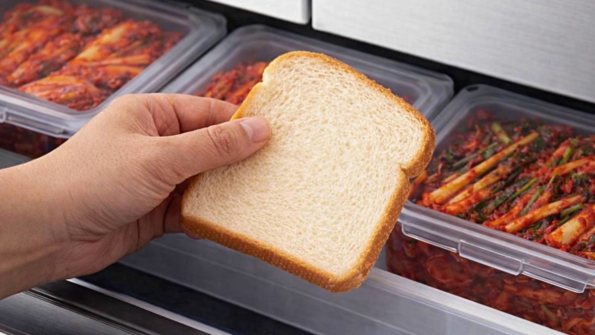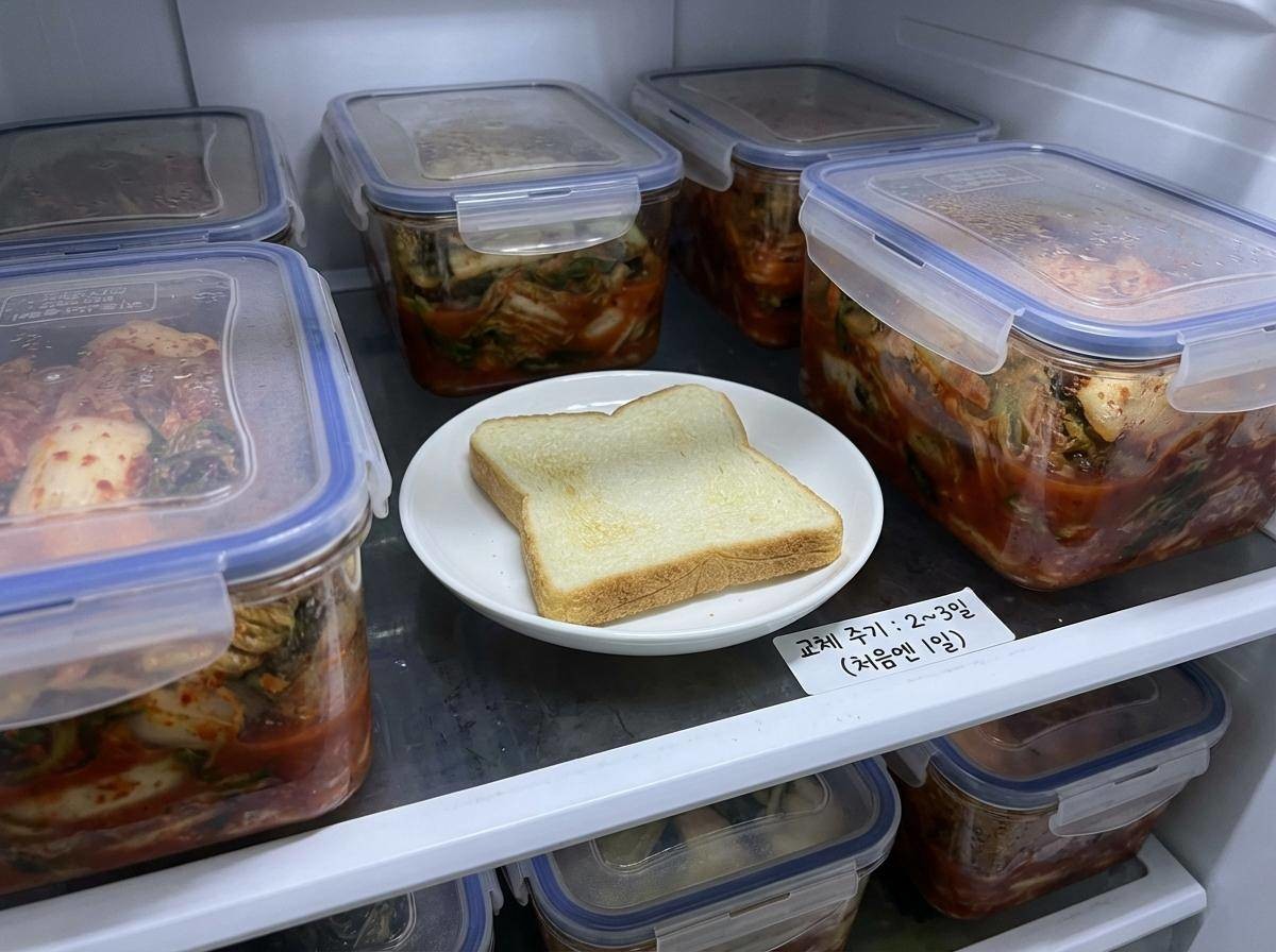식빵은 냄새를 흡착할 뿐 김치의 발효 속도나 맛을 바꾸는 역할은 하지 않는다. 다만 식빵이 김치통 안에 직접 닿거나 국물에 젖으면 위생 문제가 생길 수 있으니 반드시 접시 등에 올려 분리해 두는 게 기본이다.