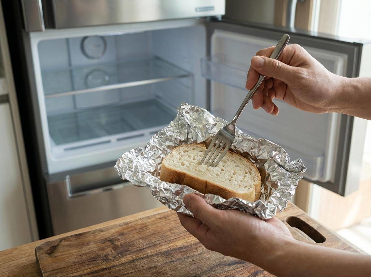 생활꿀팁으로 자주 언급되는 방식은 '호일'을 함께 쓰는 방법이다. 식빵을 알루미늄 포일로 느슨하게 감싼 뒤 젓가락이나 포크로 작은 구멍을 여러 개 뚫는다. 이렇게 하면 식빵이 냉장고 안 습기를 한 번에 많이 먹어 눅눅해지는 걸 막아주고, 구멍을 통해 냄새 분자만 비교적 천천히 흡착되도록 도와준다. 실제로 커뮤니티와 주부들 사이에서 이 방식이 더 오래 간다는 경험담이 많다.