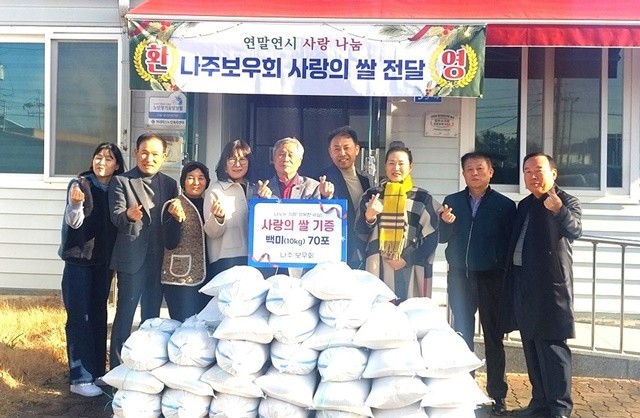 [위키트리 광주전남취재본부 노해섭 기자]나주보우회(회장 김성대)는 지난 30일 연말을 맞아 불우이웃돕기 사랑나눔 기부 물품인 백미(10kg) 70포를 나주시 이창동에 소재한 까리따스노인복지센터에 전달했다.