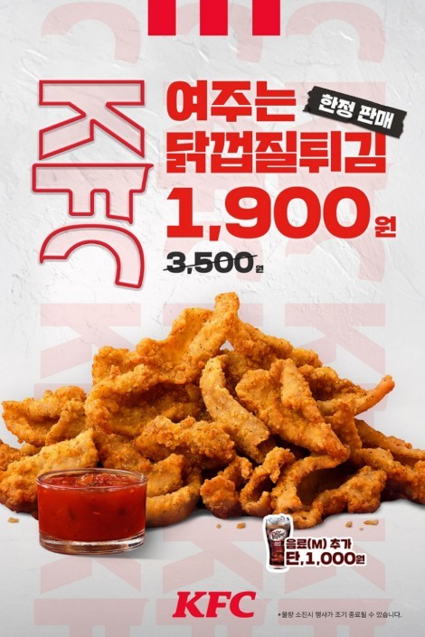 ‘닭껍질튀김 1,900원 프로모션’은 1월 26일(월)까지 일부 특수 매장을 제외한 전국 KFC 매장과 자사 공식 앱을 통해 이용 가능하다.