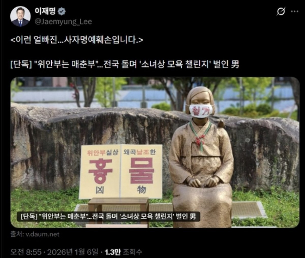 이 대통령은 6일 자신의 사회관계망서비스에 이 대통령은 6일 오전 X(구 트위터)에 “이런 얼빠진…사자명예훼손 입니다”란 게시글과 함께 중앙일보의 이날 단독 보도 "위안부는 매춘부…전국 돌며 '소녀상 테러' 벌인 男"를 공유했다.