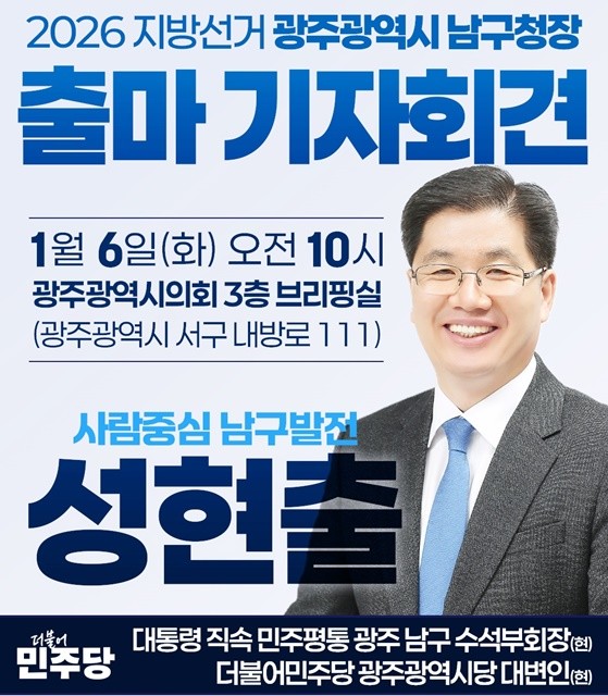 성현출 대통령직속 민주평화통일자문회의 광주남구 수석부회장이 6일 출사표를 던지며 남구청장 선거전의 불을 지폈다. 그는 지금의 남구를 ‘위기’로 규정하고, 안일한 현상 유지 대신 강력한 돌파구를 제시했다.
