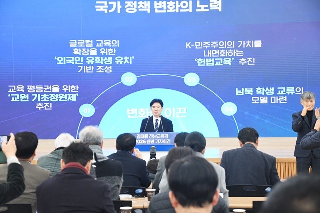 6일 오전, 전남교육청 대회의실은 김대중 교육감의 결기 찬 목소리로 가득 찼다. 신년 기자회견에서 김 교육감은 지난 3년 6개월을 "맨땅에서 희망을 일군 시간"이라고 회고했다. 정부의 일방적인 교원 감축 칼바람에 맞서 '기초정원제'라는 방패를 만들어냈고, 외국인 유학생 비자 제도를 뜯어고치며 닫힌 문을 열었다.
