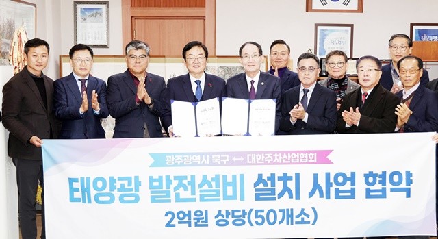[위키트리 광주전남취재본부 노해섭 기자]광주 북구(청장 문인)와 대한주차산업협회(중앙회장 최순모)는 6일 청장실에서 저전력 주간사용 취약시설인 관내 경로당 50개소에 2억원 상당의 박막형 태양광 발전 무상설비 업무협약을 체결했다.