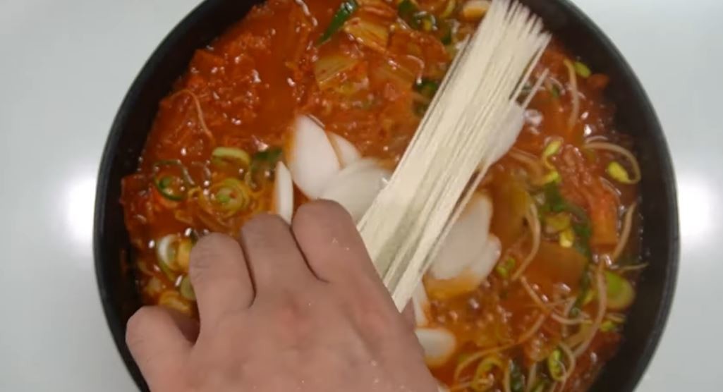 밥이 어느 정도 풀어졌다면 떡을 먼저 넣는다. 떡은 익는 데 시간이 조금 걸리기 때문에 이 순서가 중요하다. 떡이 말랑해질 즈음 불을 중약불로 줄이고, 소면을 반으로 부러뜨려 넣는다. 소면은 오래 끓이면 퍼지기 쉬우니 넣은 뒤에는 자주 저어주며 상태를 살핀다.