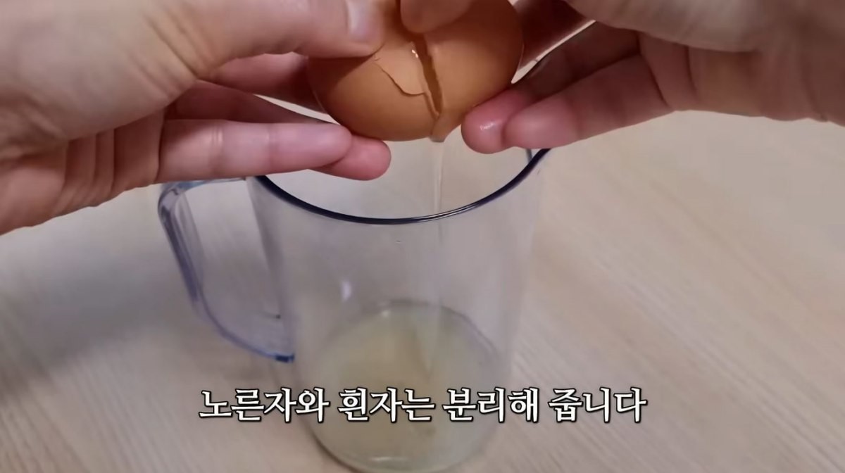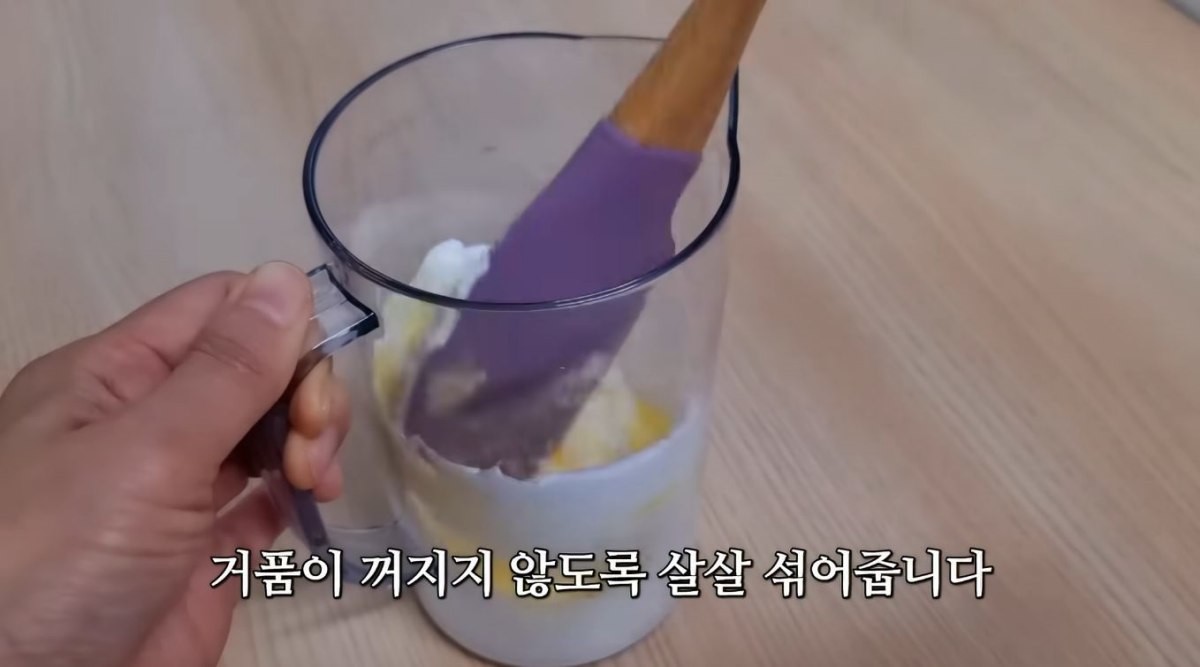 머랭이 점차 단단해지면 소금 한 꼬집을 넣어 간을 맞춘 뒤 한 번 더 휘핑해 흐르지 않을 정도로 탄탄한 질감을 완성했다. 이후 미리 섞어둔 노른자를 머랭에 넣고, 거품이 꺼지지 않도록 주의하며 가볍게 섞어 반죽을 완성했다.