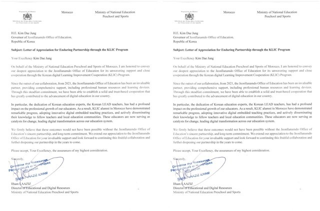 이번 감사 서한은 전남교육청이 2021년부터 추진해 온 교육 정보화 지원 사업(KLIC)을 통해 모로코의 디지털 교육 환경 개선에 기여한 공로에 대한 감사의 뜻을 담고 있다. 모로코 교육부는 서한에서 단기적 지원을 넘어 장기적인 관점에서 협력을 이어온 전남교육청에 깊은 감사를 표했다.