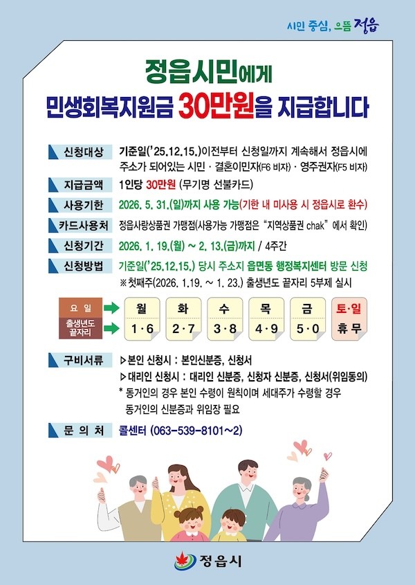 이학수 시장은 “정읍시가 계속되는 경기 침체 속에서 시민들의 어려움을 함께 나누고자 다시 한번 민생회복지원금을 지원하게 됐다”며 “이번 지원이 지역경제 회복의 마중물이 되길 바라며, 앞으로도 정읍시는 시민 생활 안정과 민생 회복을 위해 최선을 다하겠다”고 말했다.