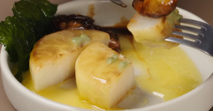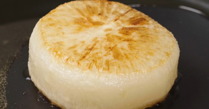이 요리의 핵심은 무를 ‘채소’가 아닌 ‘스테이크’로 대하는 데 있다. 무는 손가락 두께가 아니라 최소 3센티 이상으로 큼직하게 썰어야 한다. 단면이 넓을수록 열을 머금는 시간이 길어지고, 속까지 익는 동안 자연스러운 단맛이 올라온다. 껍질은 완전히 벗기되 모서리를 둥글게 다듬어 굽는 과정에서 수분 손실을 줄이는 것이 좋다.