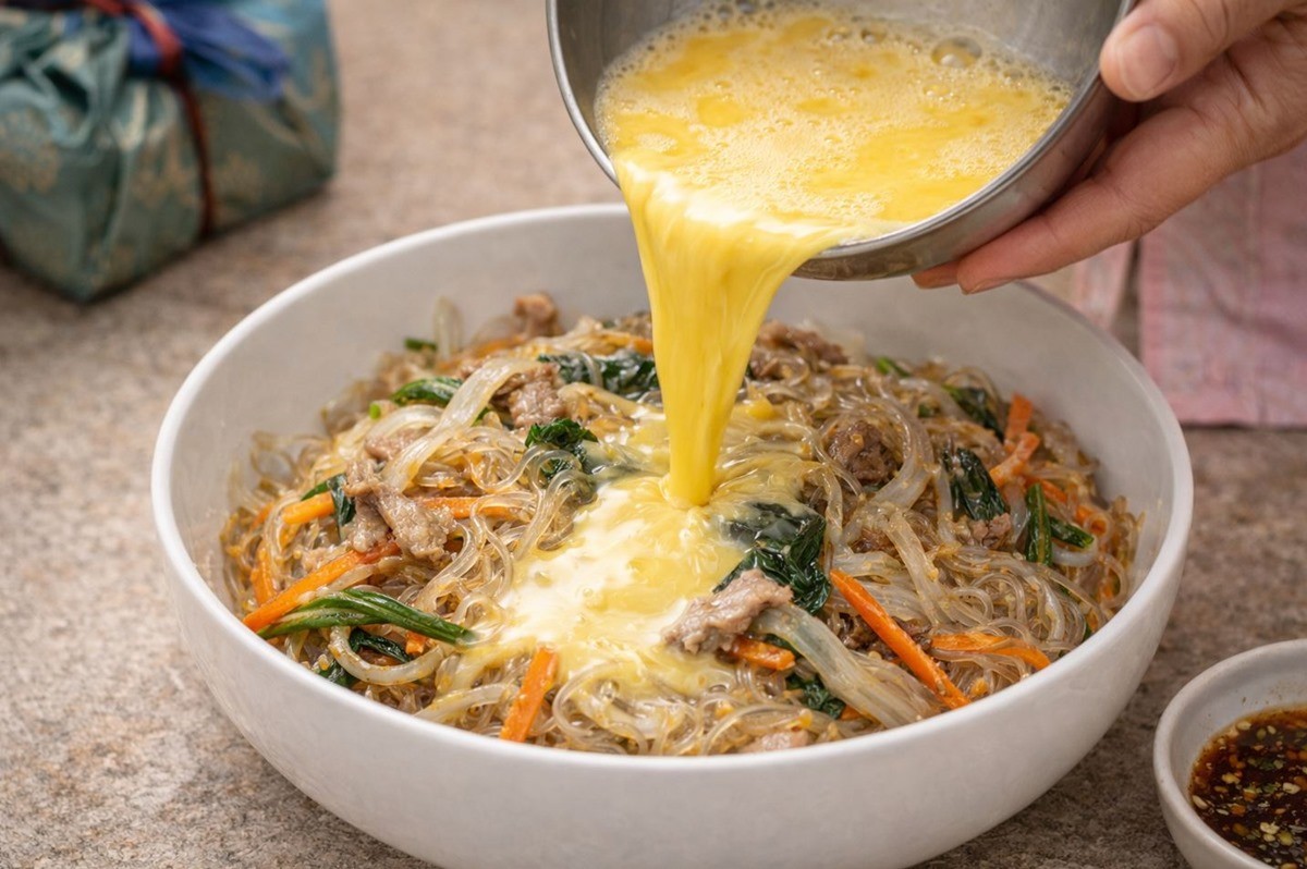 손질한 잡채를 계란물에 넣고 살살 섞는다. 이때 잡채를 으깨듯 섞기보다는 계란물이 고루 묻도록 가볍게 버무리는 느낌이 중요하다. 잡채가 계란물에 잠길 정도가 아니라 재료를 서로 이어 주는 접착제 역할을 할 정도면 충분하다. 필요하다면 부침가루나 밀가루를 한 숟가락 정도만 추가해 형태를 잡아 줄 수 있지만 너무 많이 넣으면 잡채 특유의 식감이 사라진다.