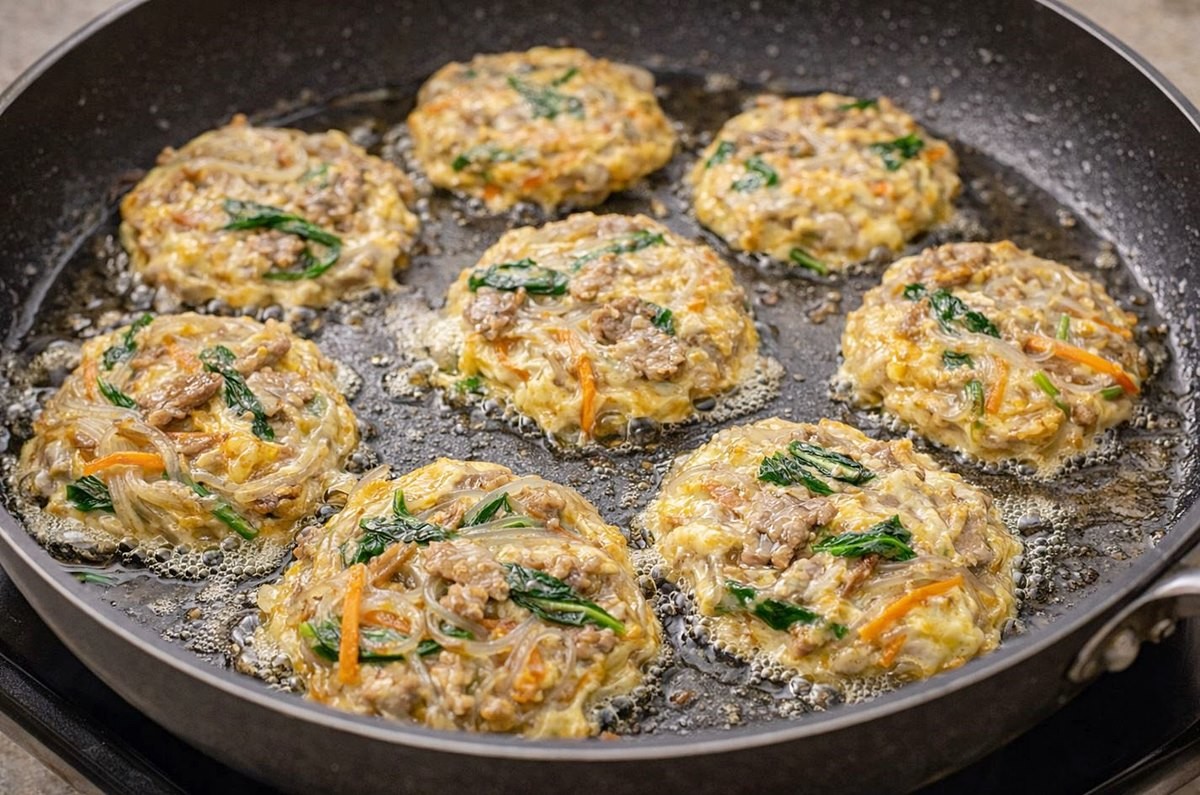 프라이팬은 중약불에서 충분히 예열한 뒤 기름을 넉넉히 두른다. 잡채전은 당면이 들어가 있어 기름이 부족하면 쉽게 눌어붙는다. 한 숟가락씩 떠서 팬에 올린 뒤 숟가락 뒷면으로 살짝 눌러 모양을 잡아 준다. 처음에는 손대지 말고 바닥이 단단해질 때까지 기다렸다가 한 번만 뒤집는 것이 좋다. 자주 뒤집으면 계란물이 흘러내리고 모양이 흐트러진다.