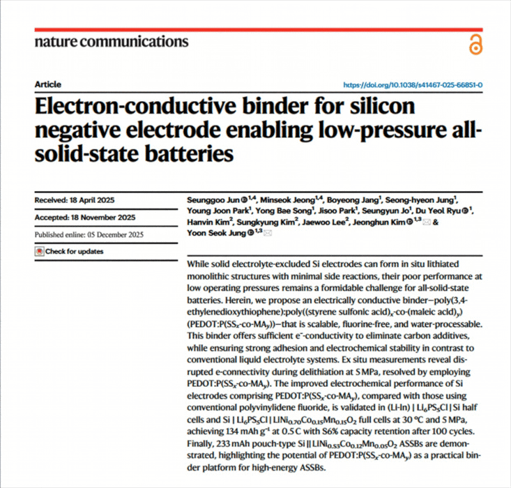 국제 학술지 네이처 커뮤니케이션스도 이번 성과를 비중 있게 다뤘다. 연구 논문은 배터리 내부의 액체 전해질을 고체로 바꾸는 과정에서 필연적으로 발생하는 저항 문제를 해결하고, 기존에 사용이 제한적이었던 전도성 소재를 전고체 환경에서 안정적으로 구현했다는 평가를 받으며 지난해 12월 게재됐다.
