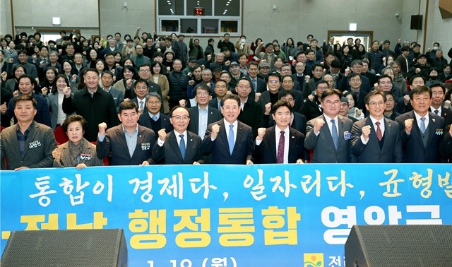 전라남도는 19일 오전 영암군 청소년센터 대강당에서 김영록 지사와 김대중 전남교육감, 지역 주민 500여 명이 참석한 가운데 광주·전남 행정통합을 위한 첫 도민공청회를 개최했다.