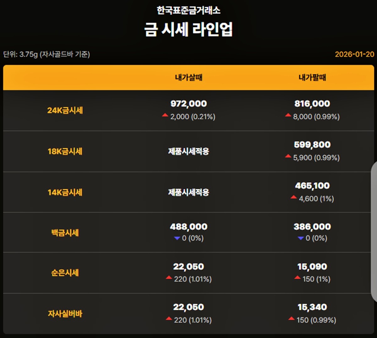 대한민국 자본시장을 종합적으로 관장하는 한국거래소 기준 이날 오후 금가격은 다음과 같다.