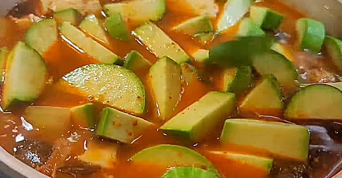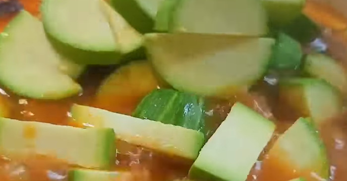 여기에 썰어둔 애호박을 넣어 기름에 한 번 코팅하듯 볶아준다. 애호박은 수분이 많은 채소라 기름을 만나면 자연스럽게 단맛이 올라온다. 이때 애호박을 오래 볶을 필요는 없다. 겉면이 살짝 투명해질 정도면 충분하다. 이후 물을 붓는데, 이 물이 곧 찌개의 국물이 된다. 별도의 육수가 필요 없다는 점이 이 찌개의 가장 큰 장점이다.