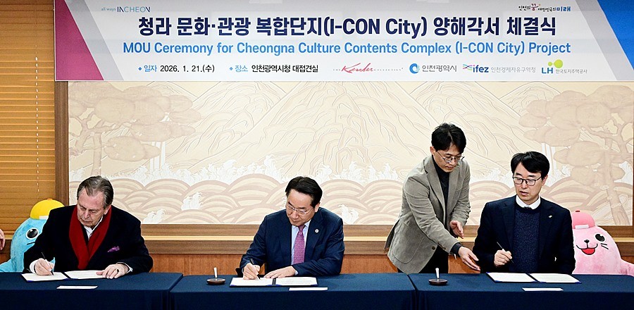 인천경제자유구역청은 21일 인천시청에서 미국 플로리다주 호스피탈리티(숙박·관광) 기업인 케슬러 컬렉션(The Kessler Collection) 및 한국토지주택공사(LH)와 청라국제도시 내 ‘청라 문화·관광 복합단지(이하 청라 I-CON City: Incheon Contents City) 프로젝트’추진을 위한 양해각서를 체결했다고 밝혔다.