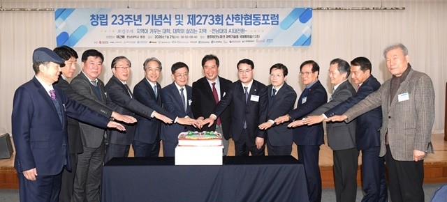 [위키트리 광주전남취재본부 노해섭 기자]김영문 광주광역시 문화경제부시장이 21일 오전 광주테크노파크 국제회의실에서 열린 제273회 산학협동포럼에 참석해 참석자들과 함께 창립23주년 축하떡을 자른 뒤 기념촬영을 하고 있다. /광주광역시 제공
