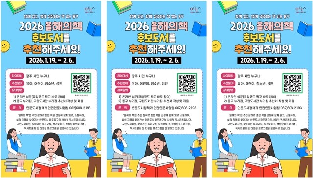 [위키트리 광주전남취재본부 노해섭 기자] 광주시 동구는 한 해 동안 시민과 함께 읽을 2026년 ‘책 읽는 동구 올해의 책’ 선정을 위해 후보 도서 추천을 오는 2월 6일까지 접수한다고 밝혔다.