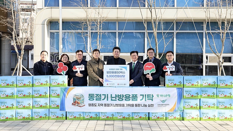 인천시 중구(구청장 김정헌)는 최근 ‘하나은행(경인지역본부 대표 전병권)’과 ‘인천공항시설관리(대표 강판석)’로부터 새해맞이 이웃사랑 실천을 위한 500만 원 상당의 방한용품 50박스를 전달받았다고 22일 밝혔다.