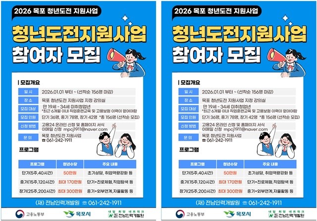 [위키트리 광주전남취재본부 노해섭 기자]목포시는 고용노동부 공모사업인 ‘2026년 청년도전 지원사업’에 선정됨에 따라, 구직에 어려움을 겪고 있는 지역 청년을 대상으로 사업 참여자를 모집한다.