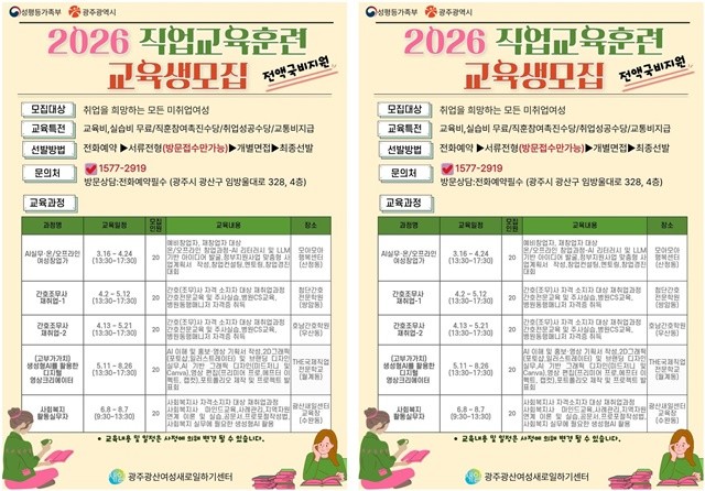 [위키트리 광주전남취재본부 노해섭 기자]광주광산여성새로일하기센터(김명화 센터장, 이하 광산새일센터)가 경력단절 여성 대상으로 취업의사가 분명하고 훈련에 적극적으로 참여하고자 하는 ‘2026년 여성가족부 국비지원 직업교육훈련생’을 모집한다.