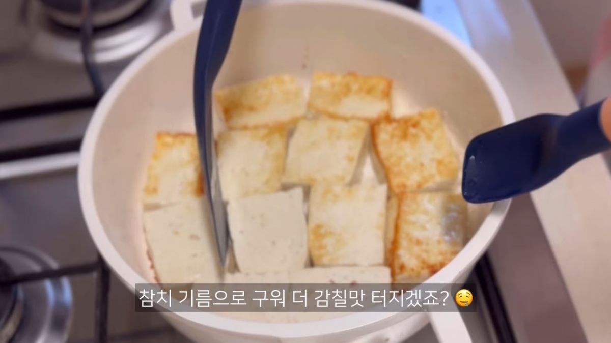 이 요리의 핵심은 두부를 참치캔의 기름으로 먼저 구워내는 과정이다. 두부를 도톰하게 썰어 냄비에 펼쳐 담은 뒤, 참치캔에서 기름만 따라내 앞뒤로 노릇하게 구워주면 겉은 쫀득하고 속은 부드러운 식감이 살아난다. 이 한 단계만으로도 두부 특유의 담백함에 깊은 풍미가 더해진다.