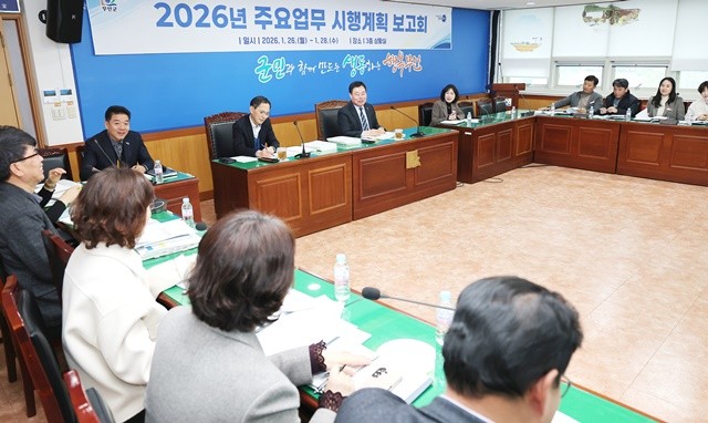 [위키트리 광주전남취재본부 노해섭 기자]무안군(군수 김산)은 지난 1월 26일부터 실·단·과·소별로 ‘2026년 주요업무 시행계획 보고회’를 열고, 군정 핵심사업과 신규사업을 점검했다고 밝혔다.