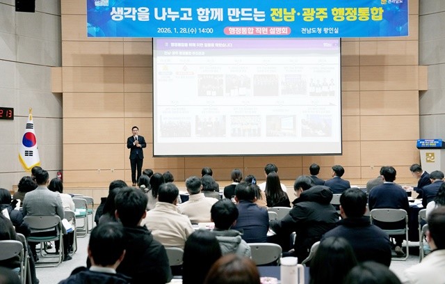[위키트리 광주전남취재본부 노해섭 기자]전라남도(도지사 김영록)는 28일 도청 왕인실에서 직원들을 대상으로 ‘전남·광주 행정통합 직원설명회’를 열고, 추진 경과와 주요 쟁점을 공유하며 직원 의견을 청취했다.