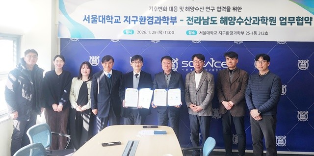 [위키트리 광주전남취재본부 노해섭 기자]전라남도해양수산과학원(원장 김충남)과 국립대학법인 서울대학교 지구환경과학부(학부장 박록진)는 29일 서울대학교에서 ‘기후변화 대응 지속 가능한 해양수산 연구 체계 구축’을 위한 업무협약(MOU)을 했다.