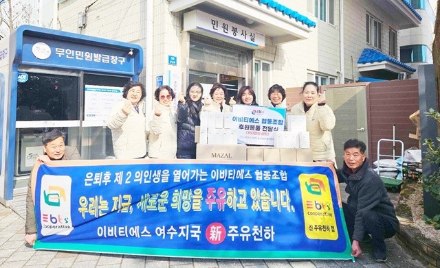 이비티에스 협동조합은 ‘상생’을 기본 정신으로 전남 동부권을 중심으로 꾸준한 봉사활동을 이어오고 있으며, 시니어와 취약계층을 위한 일자리 창출에도 힘쓰는 등 지역사회와 함께 성장하는 협동조합의 가치를 실천하고 있다.