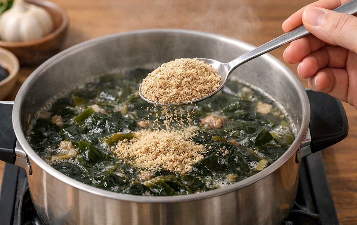 이 정도면 국물이 지나치게 걸쭉해지지 않으면서도 들깨 특유의 고소한 맛과 향이 은은하게 살아난다. 처음에는 적은 양을 넣어 끓이다가 맛을 보고 취향에 따라 조금씩 추가하는 것이 실패를 줄이는 방법이다. 마지막으로 소금이나 국간장으로 간을 맞추면 들깨의 고소함과 미역의 시원함이 조화롭게 어우러진 들깨 미역국이 완성된다.