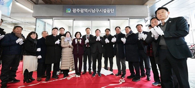 [위키트리 광주전남취재본부 노해섭 기자]광주시 남구(구청장 김병내)는 2일 오후 구청 별관동에서 ‘광주광역시남구시설공단 현판식’을 개최했다. 임형진 남구시설관리공단 이사장을 비롯한 참석 내빈들이 현판식 행사를 마치고 기념촬영을 하고 있다.