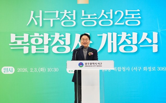 [위키트리 광주전남취재본부 노해섭 기자]강기정 광주광역시장이 3일 오전 광주시 서구 농성2동 복합청사 개청식에 참석해 축사를 하고 있다./광주광역시 제공